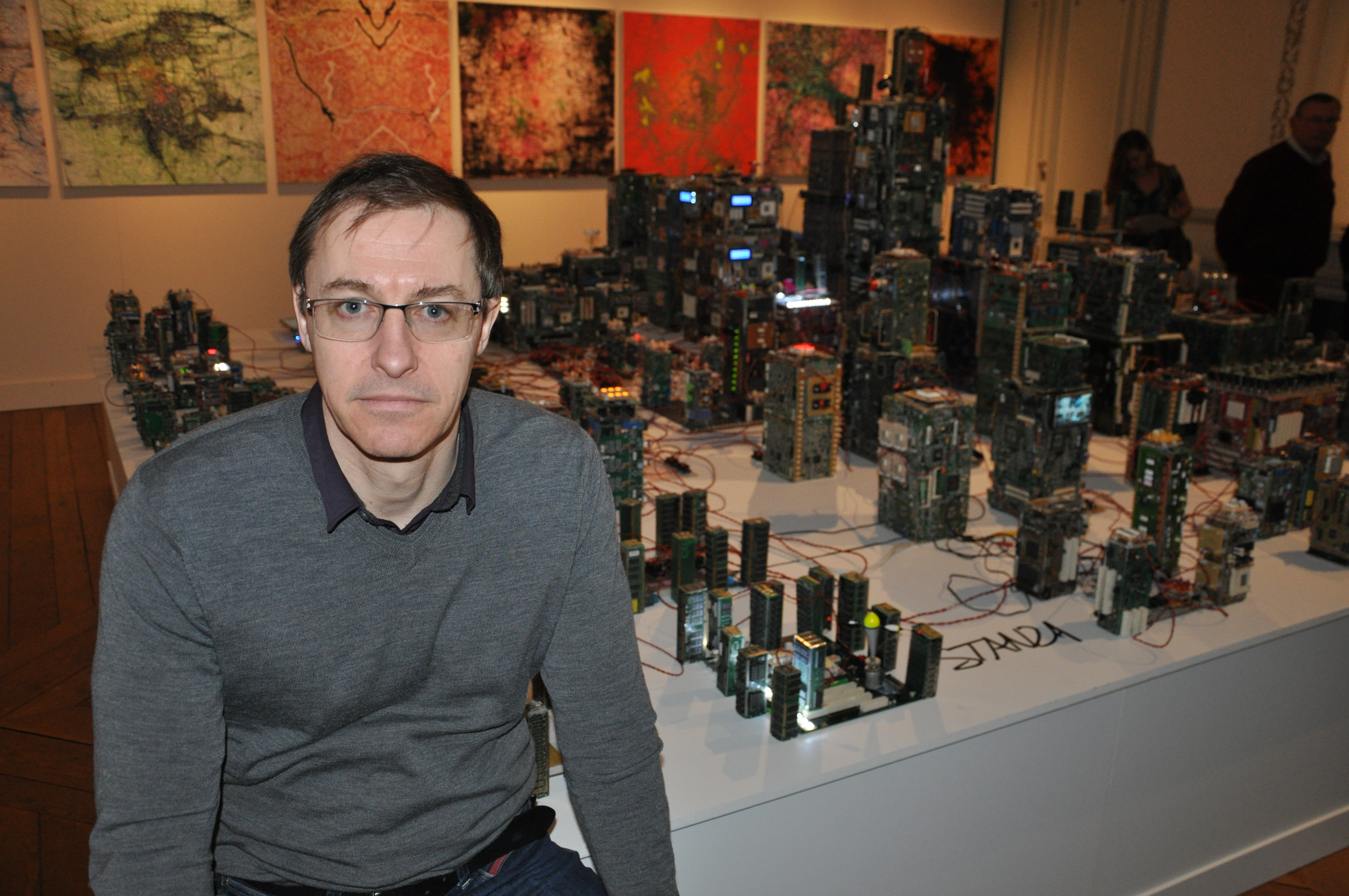 In het Arentshuis (Dyver) toont hij nu twee installaties en een reeks schilderijen. Fascinerend, dat zeker: The Nemesis Machine is een stad in het klein en bestaat uit computeronderdelen, motors, kabels en special ontworpen electronica. Deze ‘stad’ reageert op allerlei fenomenen als temperatuur, licht, luchtdruk en geluid zoals het gemeten wordt in Zuid-Londen en computergewijs overgebracht wordt naar Brugge. De schilderijen aan de wanden tonen eveneens de complexiteit vande stad. (LF)