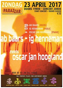 Voor het concert op 23 april brengt dit duo als gast de menig aantal decennia jongere Oscar Jan Hoogland (1983) mee. Deze pianist en componist beweegt zich net zo probleemloos op het domein van de geïmproviseerde muziek als van de dito dans. Behalve componeren voor theater- en dansvoorstellingen, ensembles en solisten, is hij frontman van eigen groepen en lid van andere gezelschappen. Met Baars heeft hij (o.a.) gemeen dat ook hij met drummer Han Bennink (de net 75 jaar geworden enige nog levende stichter van ICP) podia onveilig heeft gemaakt.