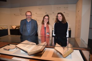 Naast boeken, omvat de tentoonstelling ook Vlaamse Primitieven en losse manuscripten zoals affiches en politieke pamfletten. “Die losse vellen bewaren minder goed omdat ze gemaakt zijn om weg te gooien,” vertelt curator Evelien Hauwaerts. “Boeken hebben een permanentere rol.” Bovendien waren de boeken beschermd onder een met lederen bedekte houten kaft. (Friese Landuyt)