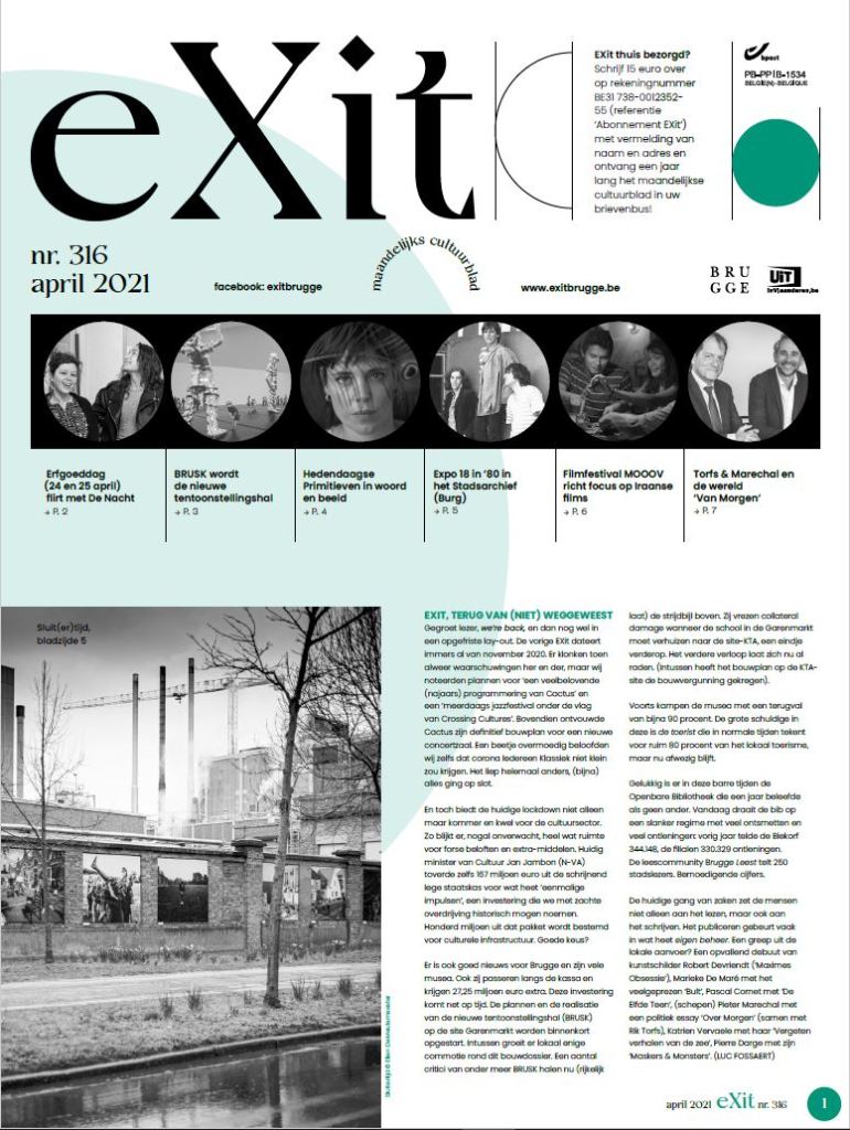 Beste lezer, sinds november 2020 kon u EXit alleen nog raadplegen nog via onze site exit.be, de enige vorm van communicatie die ons al die maanden nog restte. Vanaf morgen vrijdag 26 maart willen we terug aanknopen met ons ‘papieren verhaal’, want wie dacht dat de Brugse cultuurwereld in een winterslaap vertoefde of vertoeft, heeft het mis. EXit-april illustreert dat in woord en daad, maar dat laatste vaak virtueel.