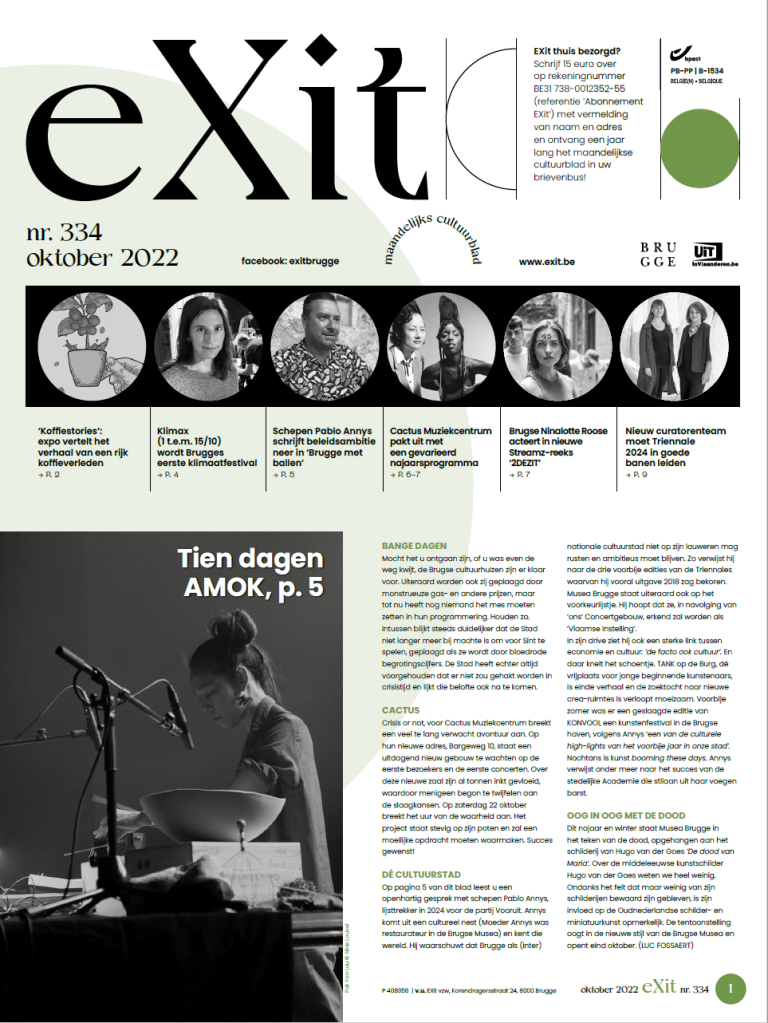 Rolf: ‘Ik snap dat dat voor een publiek moeilijker leesbaar is. Als je het geheel bekijkt, dan zie je dat we kunstenaars en muzikanten op een plek in de stad laten reageren. Wij werken met het stedelijk weefsel. Momenten van gevaar, van risico of niet vrijblijvendheid gaan creëren in de stad, daarvoor moet je nomadisch te werk gaan. Zeker in een stad als Brugge die werelderfgoedstad is, maar waarvan ook de openbare ruimte heel monofunctioneel gedefinieerd is. Het gaat over toerisme, over economie die vandaag de dag heel brutaal. Ik vind het een mooie casus door het erfgoedgegeven, door die bescherming, om te zeggen hoe je met hedendaagse kunst momenten van publieke ruimte kan creëren, in de zin van: dit is wat we delen, hier gaan we in interactie met elkaar, spreken we met elkaar en doen we iets met elkaar. Dat is ook het uitgangspunt van AMOK. Onze infrastructuur rammelt voorlopig aan alle kanten, dus zien we onze eigen ruimte als een hub, een vertrekpunt. We zullen altijd andere plekken in de stad nodig hebben om dat te doen. Vandaar dat we samenwerken met Musea Brugge. Zo hebben we opeens twintig zalen ter beschikking. Dat geldt ook voor het Concertgebouw, het Cultuurcentrum, Cactus Muziekcentrum, De Republiek, Cinema Lumière, Snuffel, kerkfabrieken, zelfs met het stedelijk zwembad Guilini gaan we een samenwerking aan. Met AMOK gaan we zelfs proberen om monumenten in te pakken. Het is echt een bevraging van wat is hedendaagse kunst in een erfgoedstad. Dat is ook de lijn die Brugge met Oostende verbindt.’